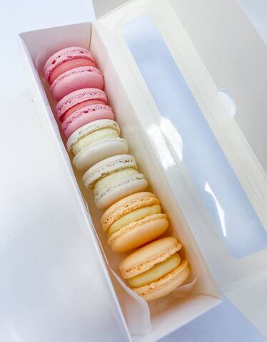 - пирожные макарон ваниль, манго и клубничные по 2 шт. каждого - 6 шт.
