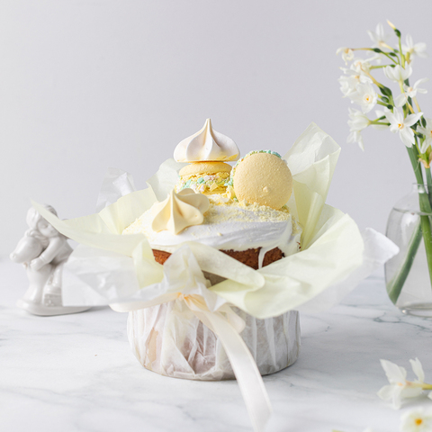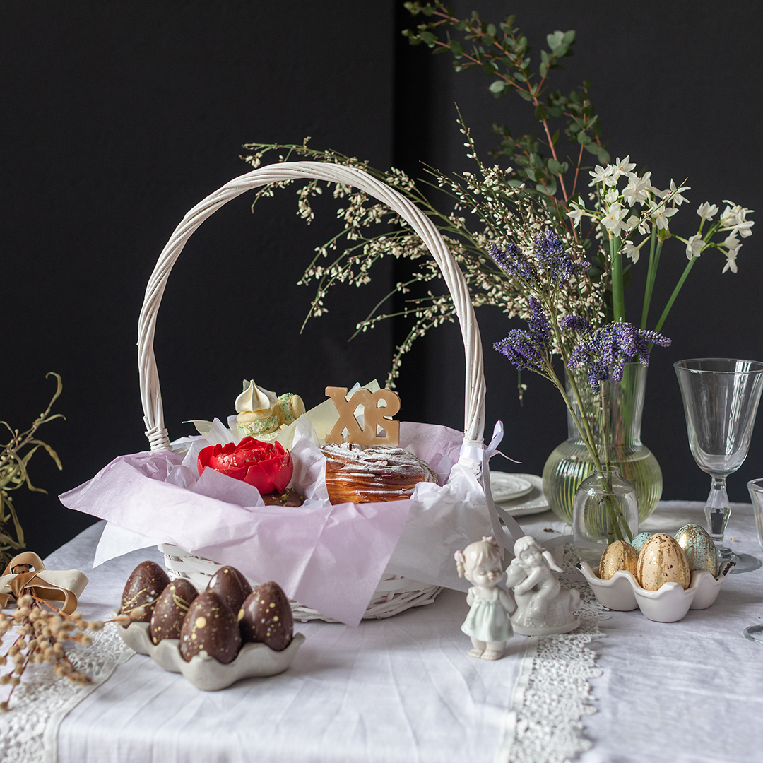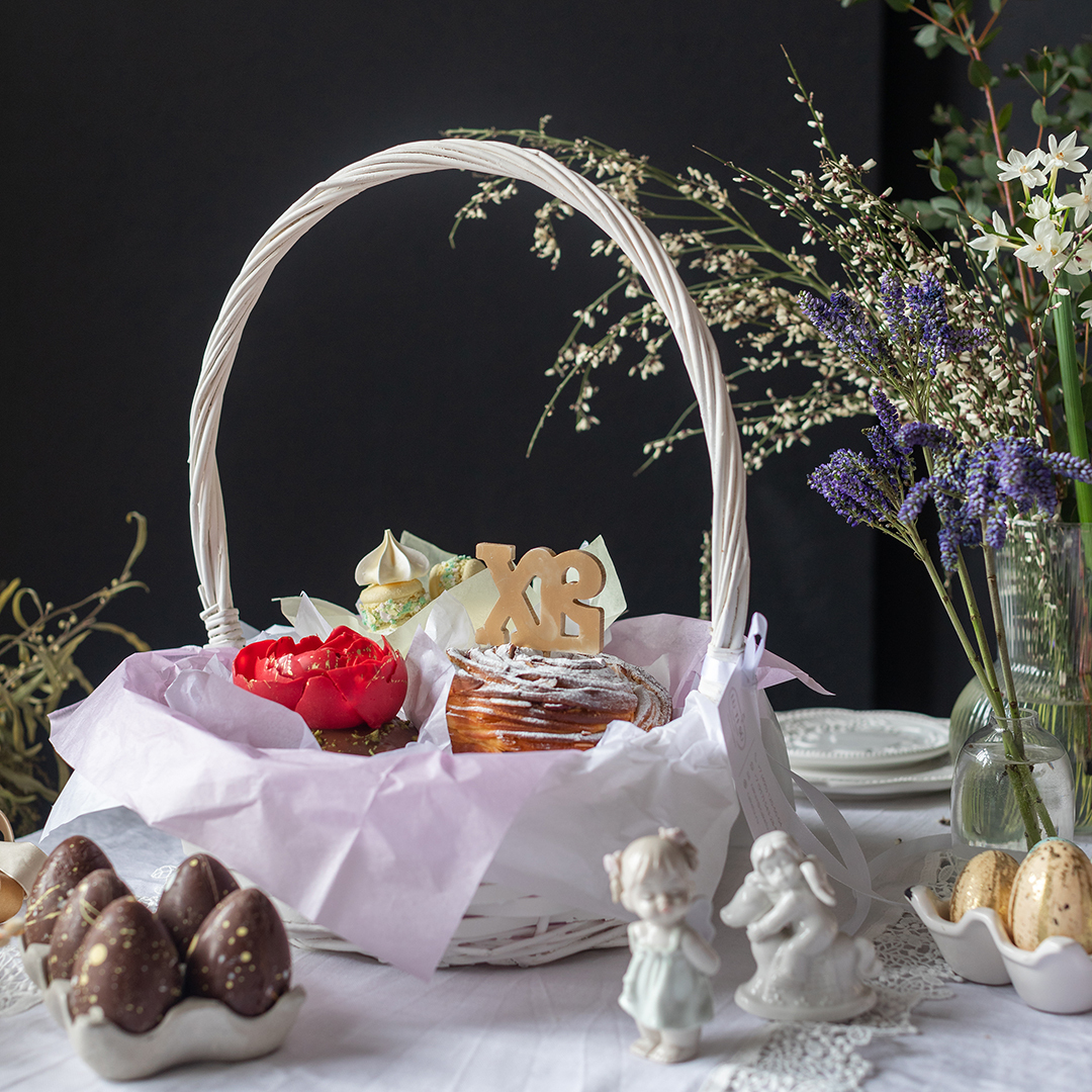 в корзине "Весна" мы собрали сочные, витаминные куличи, украсили шоколадом и миндальными пирожными макаронс.